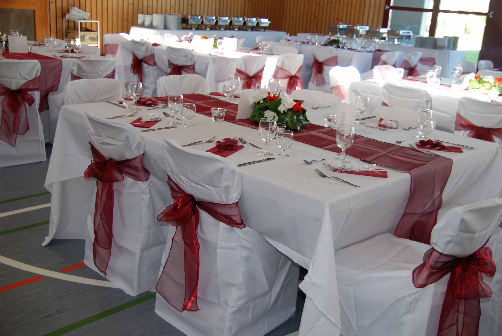 Nous mettons à votre disposition: Des housses de chaises blanches, Selon vos désirs un ruban et un chemin de table à la couleur de votre choix pour rappeler le thème de votre soirée, des nappes blanches, tour pour la table d’honneur.